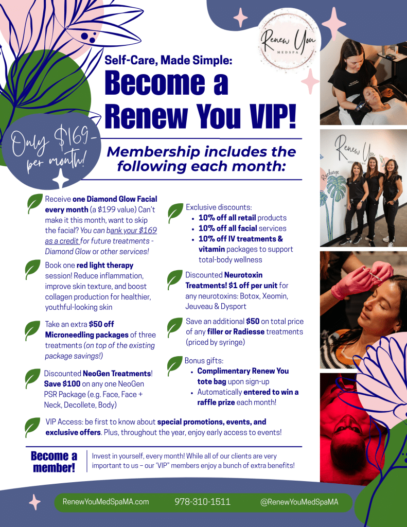 Sign up today and receive a complimentary Renew You tote bag, perfect for carrying your skincare essentials and showcasing your VIP status.